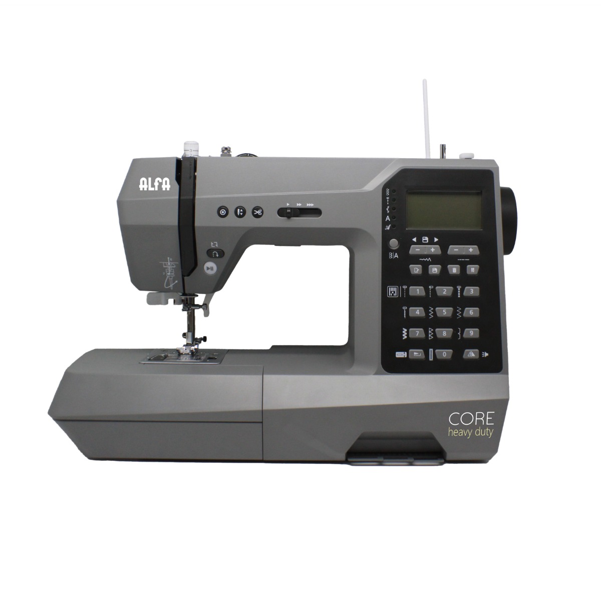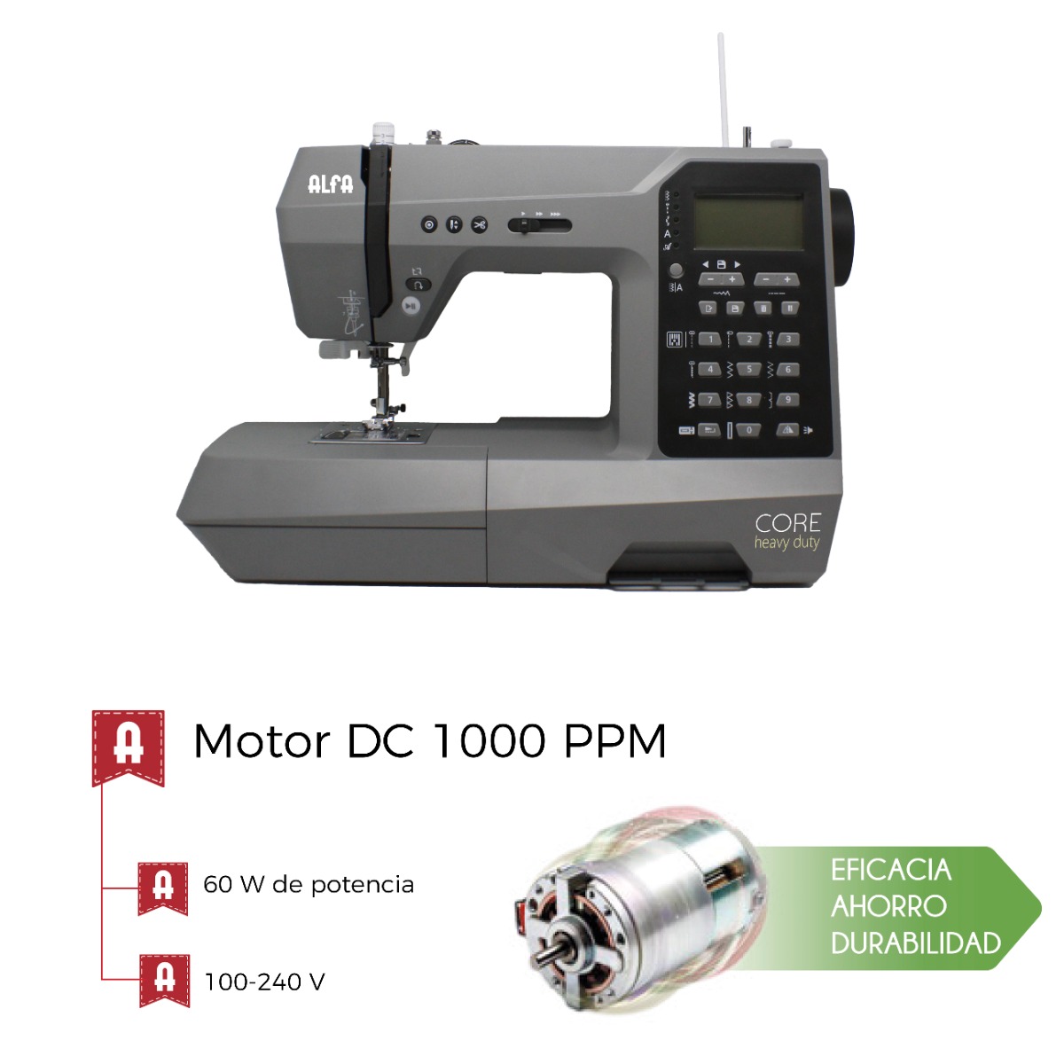 La Alfa Core –heavy duty- es la máquina para coser y acolchar que combina eficiencia, precisión y resistencia. Pensada para quienes buscan resultados profesionales incluso en los proyectos más exigentes, gracias a su motor DC de 60 W asegura un rendimiento constante para coser desde los tejidos más finos hasta materiales gruesos.
