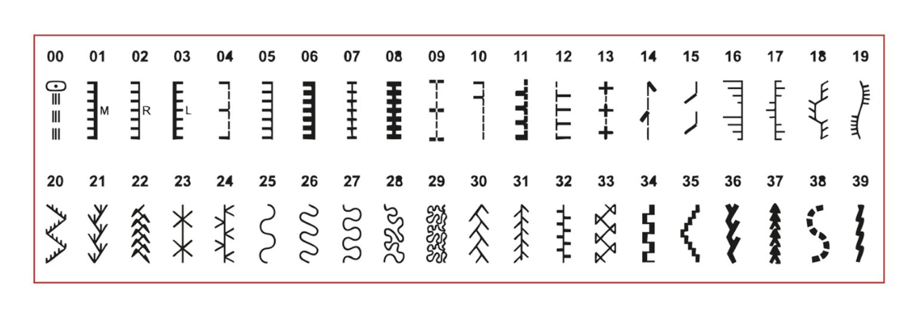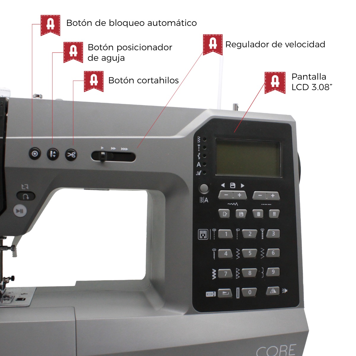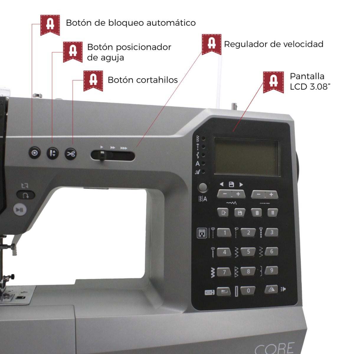 - Pantalla LCD con memoria de puntadas (4 grupos x 20 patrones) para visualización y selección intuitiva de puntadas.