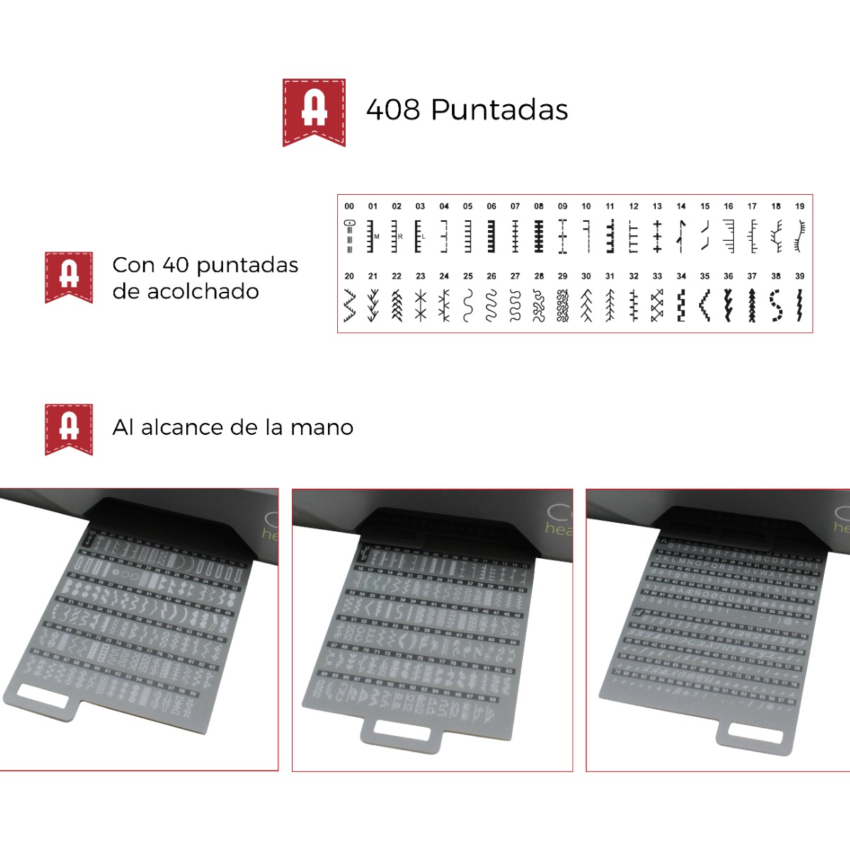 - 408 tipos de puntadas: incluye 40 puntadas específicas para quilting, además de opciones básicas y decorativas.