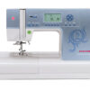 Máquina de base plana con brazo largo de 22.5cm, robusta, fiable, rápida y un todo terreno para trabajar en todo tipo de tejidos. Realiza 126 funciones distintas (incorpora varias puntadas especiales para acolchados, 7 puntos para aplicación, numerosas puntadas para realizar Patchwork, punto fagoting, punto Paris, etc.). Con garfio rotativo, plataforma extra grande y maleta