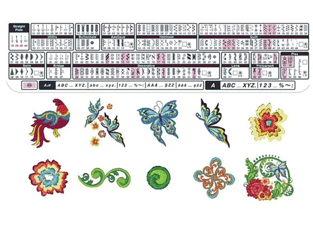 - 175 diseños de bordados incorporados.