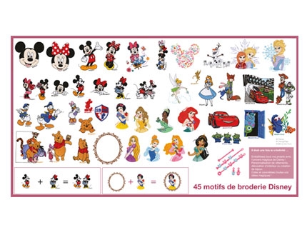 10 fuentes incluidas, 125 bordados con 45 personajes de Disney. Enmarcados de bordados Disney con 14 estilos de puntadas que pueden ser combinados con 10 formas diferentes de marcos ( circulares uy cuadrados ).