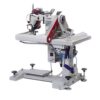 Máquina de brazo con puller neumático para el cierre de perneras de pantalón tejano.