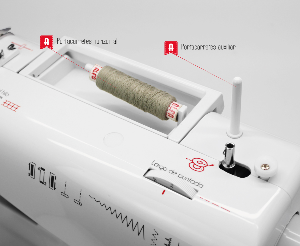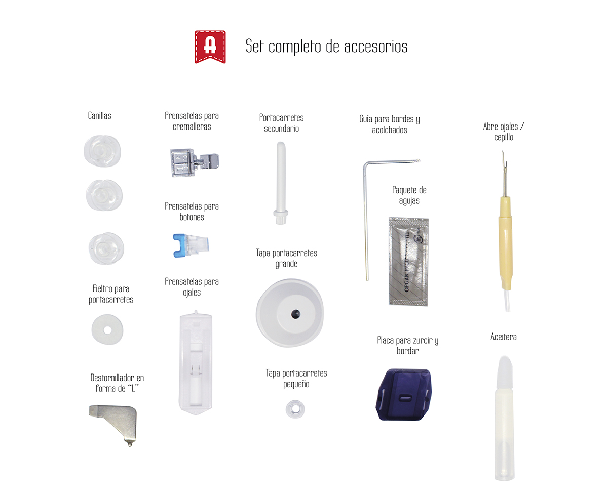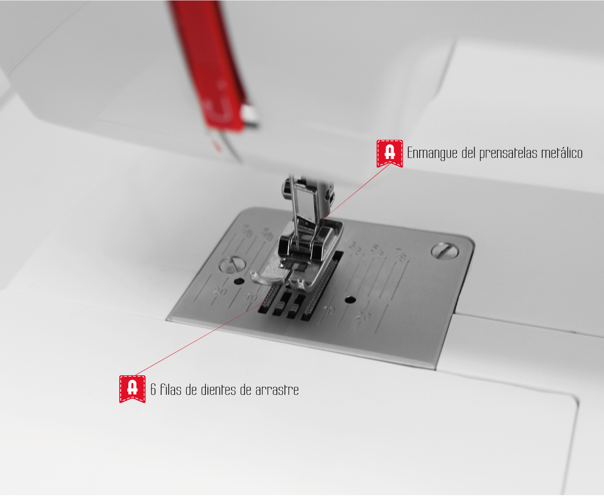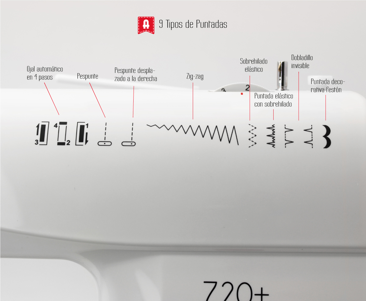 9 puntadas para todo tipo de labores: Ojal automático en 4 pasos, Básicas, Decorativas, Festones, Zig-Zag