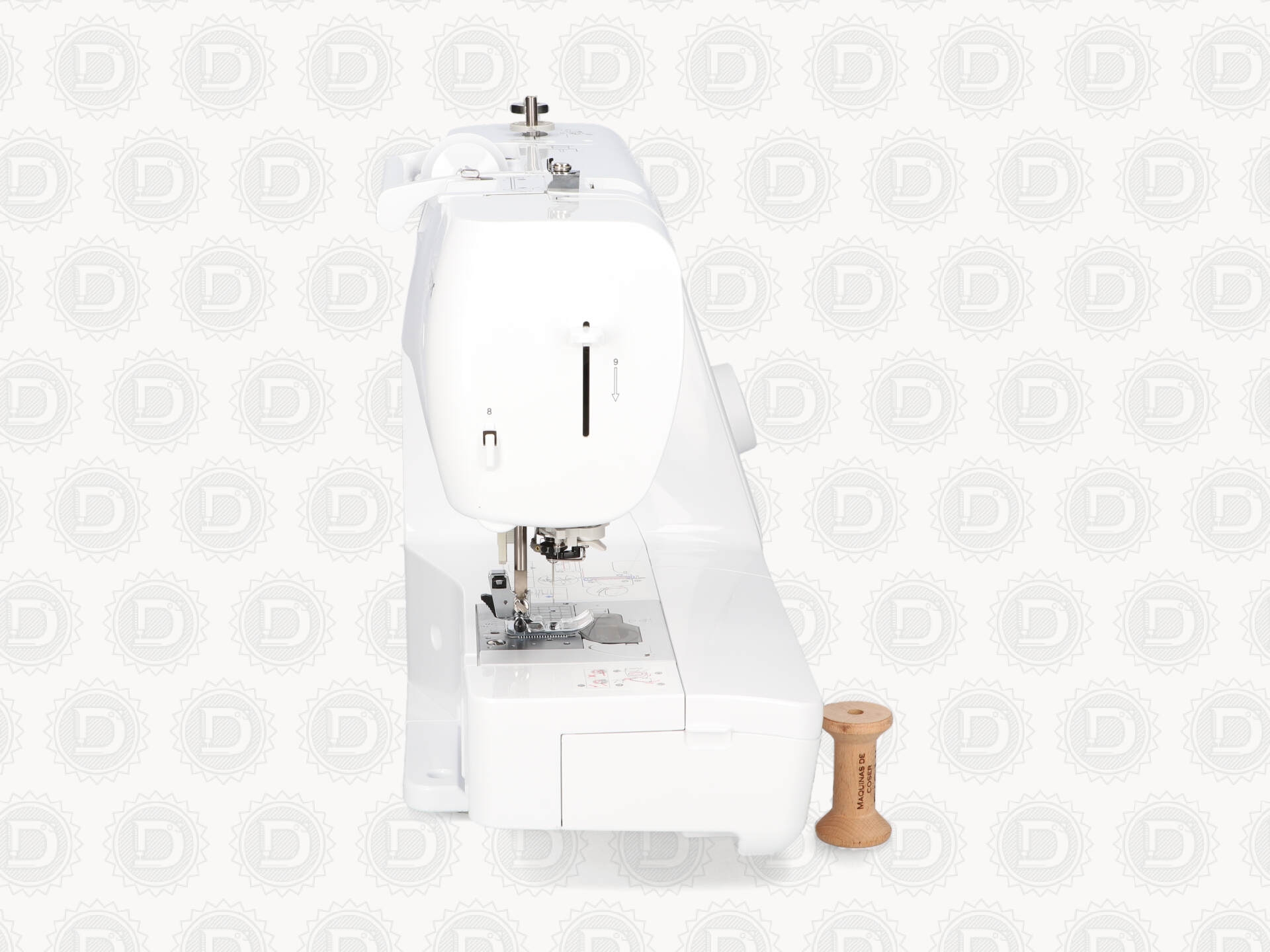 El canillero flotante nos facilita la labor y aminora el tiempo de enhebrado de la máquina, simplemente con colocar la canilla en el canillero y enhebrar el hilo por las guías adecuadas que están explicadas en las pegatinas colocadas a los lados de la chapa de aguja, tendremos la máquina preparada para coser inmediatamente.