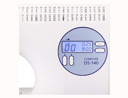 Máquina de coser electrónica de brazo libre muy silenciosa con display electrónico con 40 dibujos incluidos, 5 tipos de ojales automáticos en un solo tiempo, 2 costuras de punto de cruz, 7 mm. de anchura de zig-zag ajustable según las necesidades de costura, enhebrador automático de la aguja, regulador de velocidad.
