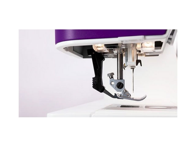 La zona de costura situada a la derecha de la aguja tiene un tamaño muy amplio 250mm que le permitirá coser cantidades grandes de tejido o guata. Su doble arrastre integrado arrastrá el tejido desde arriba y desde abajo.