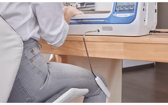 Libere sus manos usando el levantamiento de rodilla para subir / bajar el prensatelas. Ideal cuando tienes las manos llenas con proyectos grandes y voluminosos, como colchas.