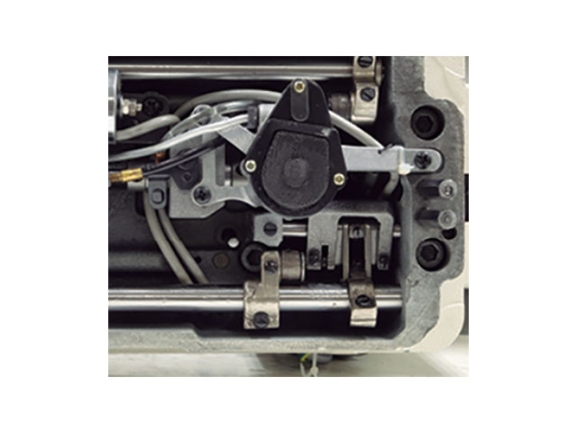Máquina de pespunte recto de 1 aguja con arrastre por prensatelas y diente equipada con engrase automático por bomba de aceite.