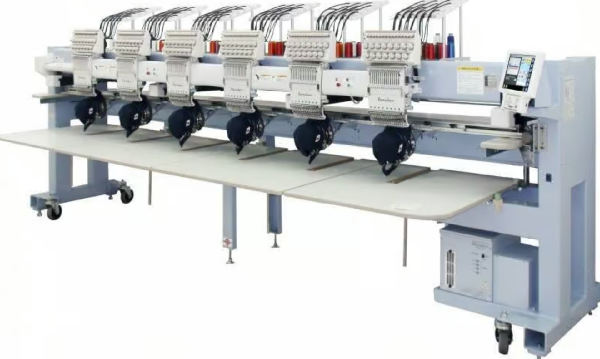 Barudan BEKT -S1506 CII MK8, de 15 hilos y seis cabezas, con mesa, perfecta para talleres de personalización textil.
