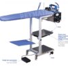 Mesa de planchar de plato universal plegable, con caldera de 5 litros de acero inoxidable, aspiración, soplado, plato calentado de nivel de agua y plancha de mano industrial con mango de madera. Medidas del plato: 110×22-35 cm.