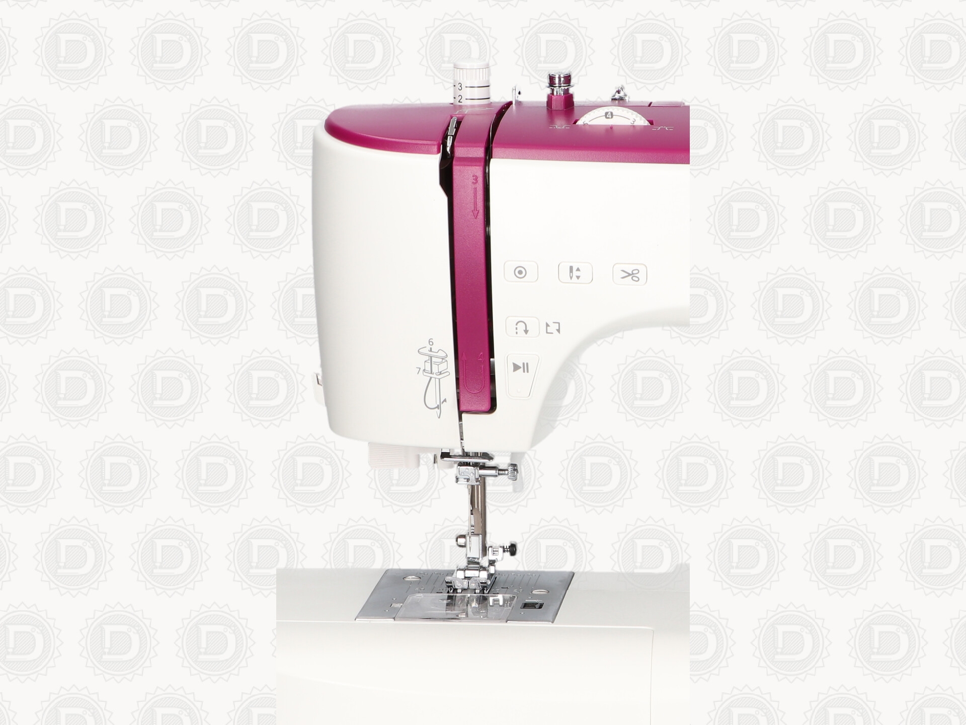 Sistema de arrastre de 7 dientes: una función especialmente pensada que garantiza que la tela se recoja y apoye desde la parte delantera del pie prénsatelas hacia atrás. Esto proporciona un arrastre mucho más preciso de la tela.
