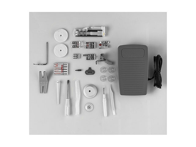 Junto con la máquina, se incluyen 8 pies rápidamente reemplazables. Está equipada con un compartimento de almacenamiento de dos partes muy práctico para accesorios.
