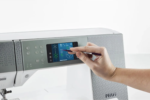 La pantalla táctil a color de la PFAFF expression™ 720 facilita la navegación por sus múltiples funciones. Desde la selección de puntadas hasta la edición y previsualización de los patrones, todo está al alcance de tus dedos de manera intuitiva. La posibilidad de guardar combinaciones de puntadas directamente en la máquina es otra ventaja para aquellos que desean tener acceso rápido a sus configuraciones favoritas.