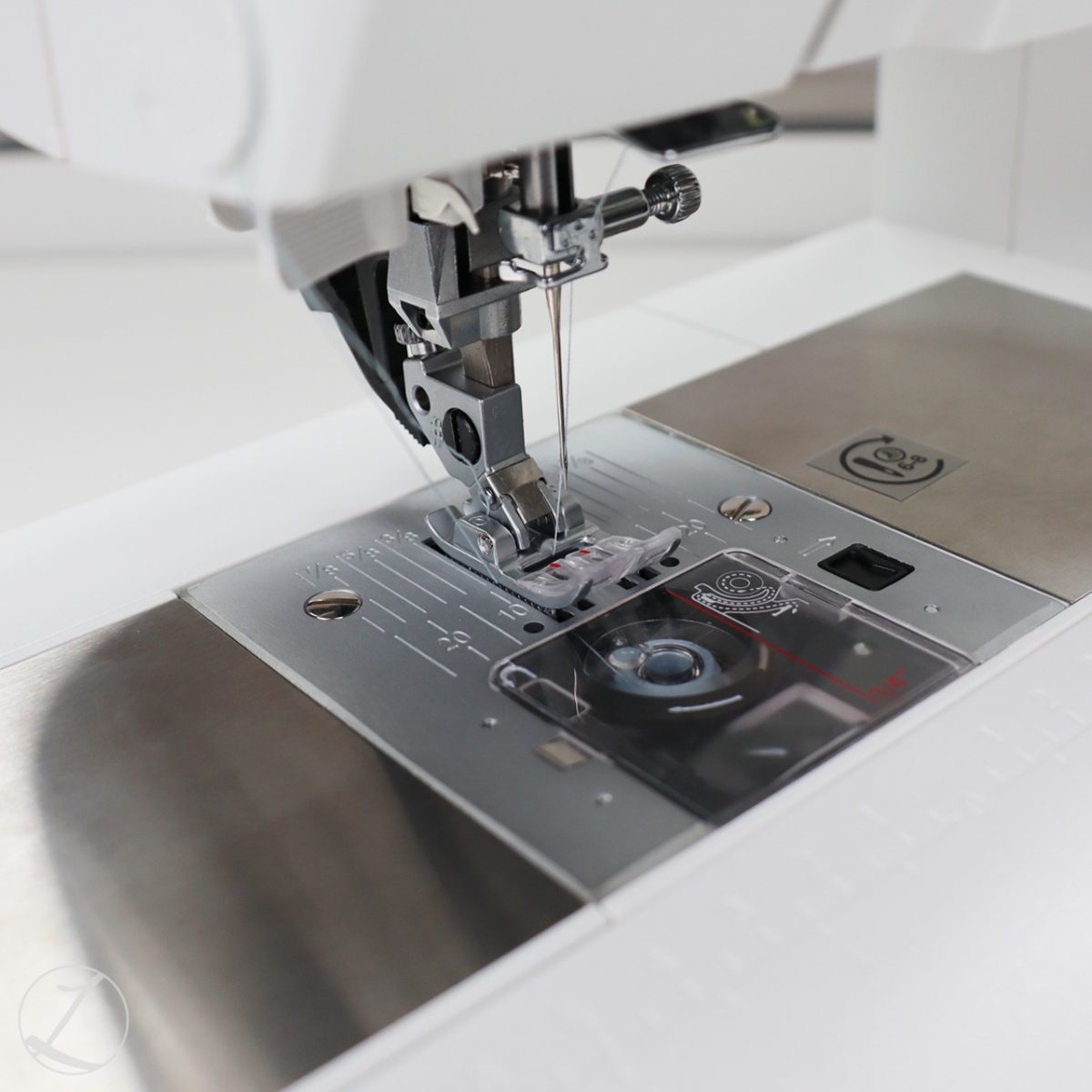 Bajada de los dientes de arrastre, tienen una ubicación práctica, desde la parte trasera del brazo libre. Es perfecta para hacer punteado, bordados de movimiento libre o zurcidos.
