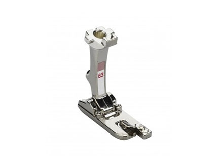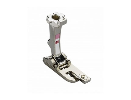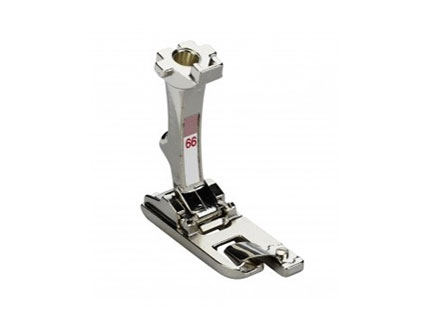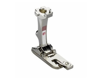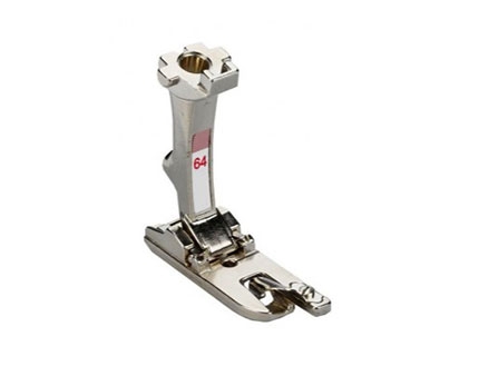 Prensatelas nº60: para doble cordón, permite coser simultáneamente dos cordones paralelos de 7 a 8 mm de diámetro. Esto es devido a sus dos ranuras. Ofrece una guía óptima para los cordones y permite hacer un trabajo uniforme y rápido. Gracias a su estructura, el prensatelas para doble cordón también se puede utilizar para coser ribetes.