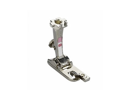 Prensatales nº69: dobladillador para punto de concha y tricot de 4 mm, es especial para coser dobladillos en telas suaves, como género de tricot. Dobla la tela dos veces por medio de una espiral y la mantiene unida con su riel-guía en la suela del prensatelas hasta que se haya cosido.