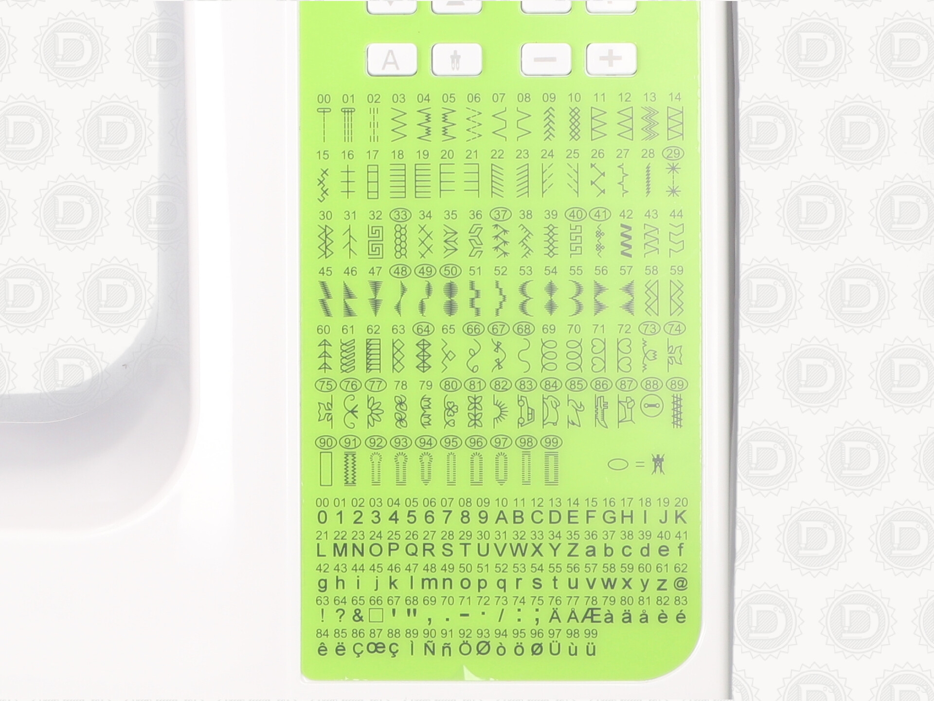 200 puntadas a elegir, todas las puntadas son modificables en largo y ancho, 1 alfabeto.