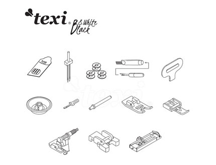 Agujas, bobinas, cepillo limpieza, prénsatelas, destornillador.