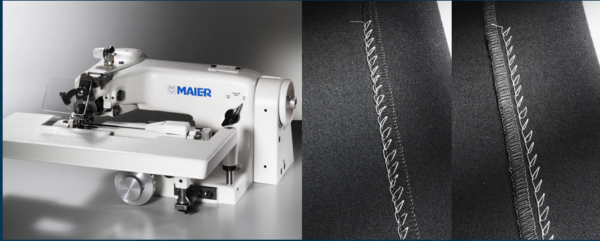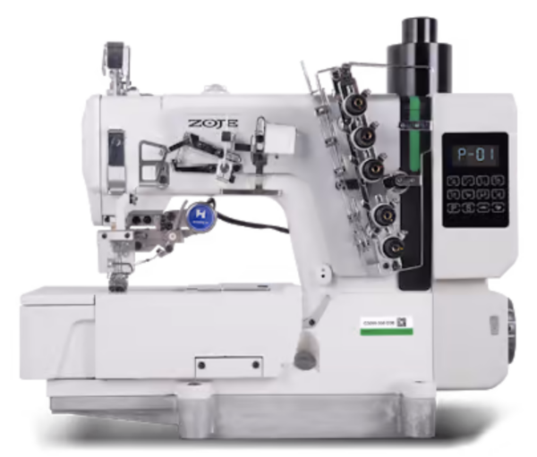 Recubridora industrial Zoje C5000-356-D3C con base plana de 3 agujas y 5 hilos con recubrimiento superior e inferior. Equipada con cortahilos superior e inferior electricos motor servo con una velocidad de 6000ppm, alzapatas electrico y luz LEDs